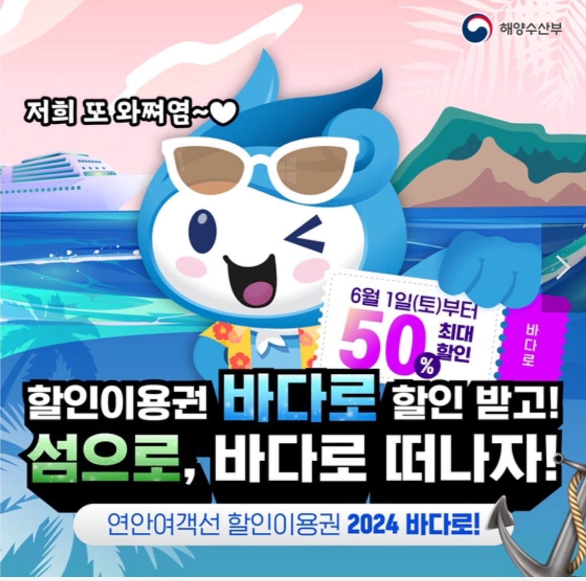 ‘바다로’란 6월 1일부터 2025년 5월 31일까지 만 35세 이하의 젊은이들이 저렴한 비용으로 우리 바다와 섬 곳곳을 여행할 수 있도록 만든 연안여객선 할인이용권(해양수산부 주관) 입니다.