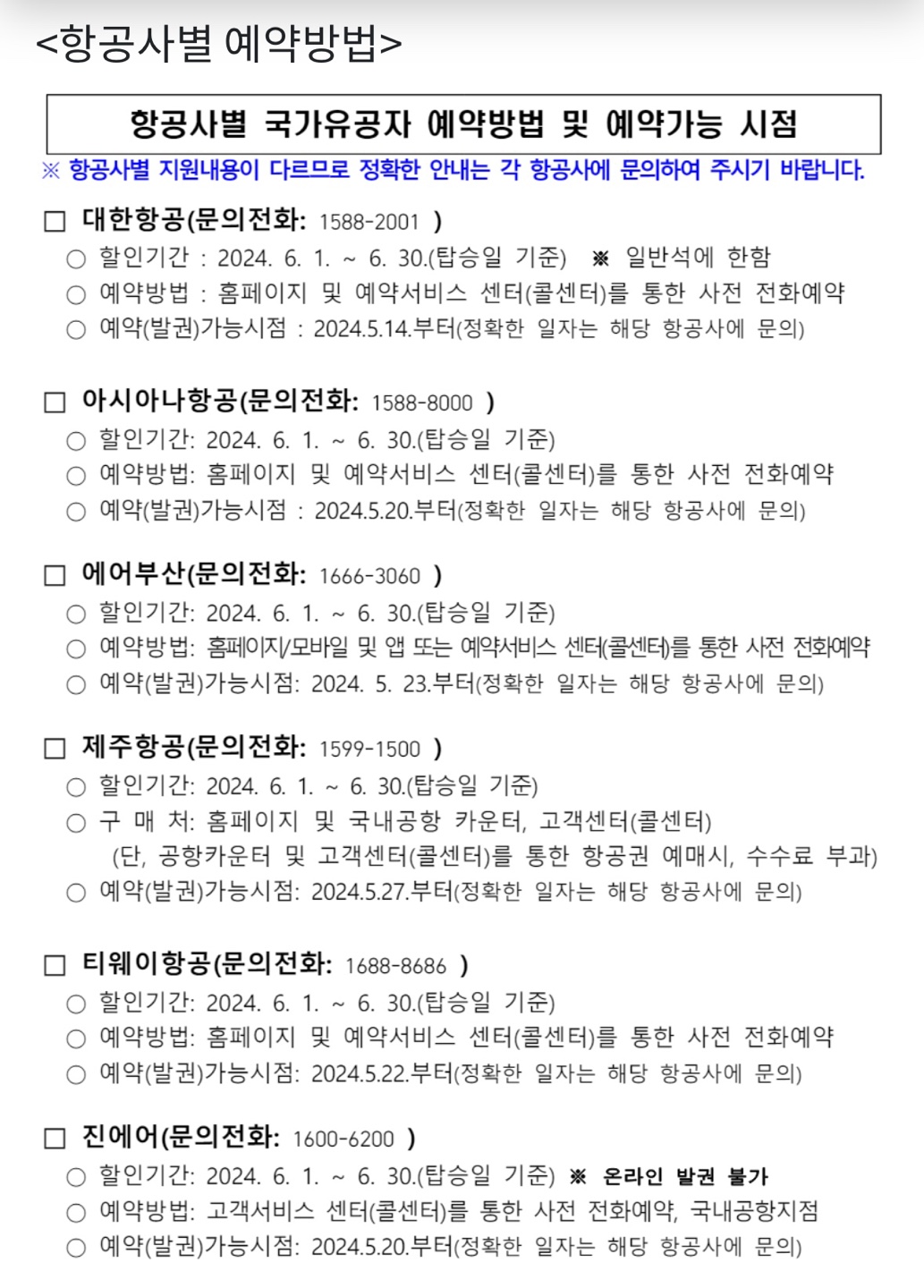 ※ 항공사별 예약방법, 할인대상 및 할인율은 아래 사진을 참고하시기 바랍니다.